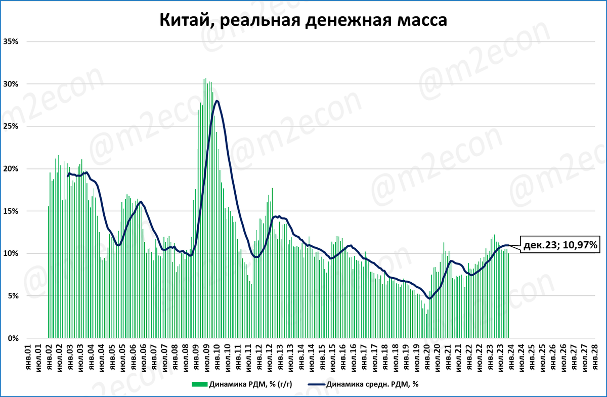 Но в денежно-кредитной политике Китая дефляция – это не проблема. Проблема в замедлении роста денежной массы, которая в декабре (+9,7%) впервые выросла темпом ниже 10% годовых.