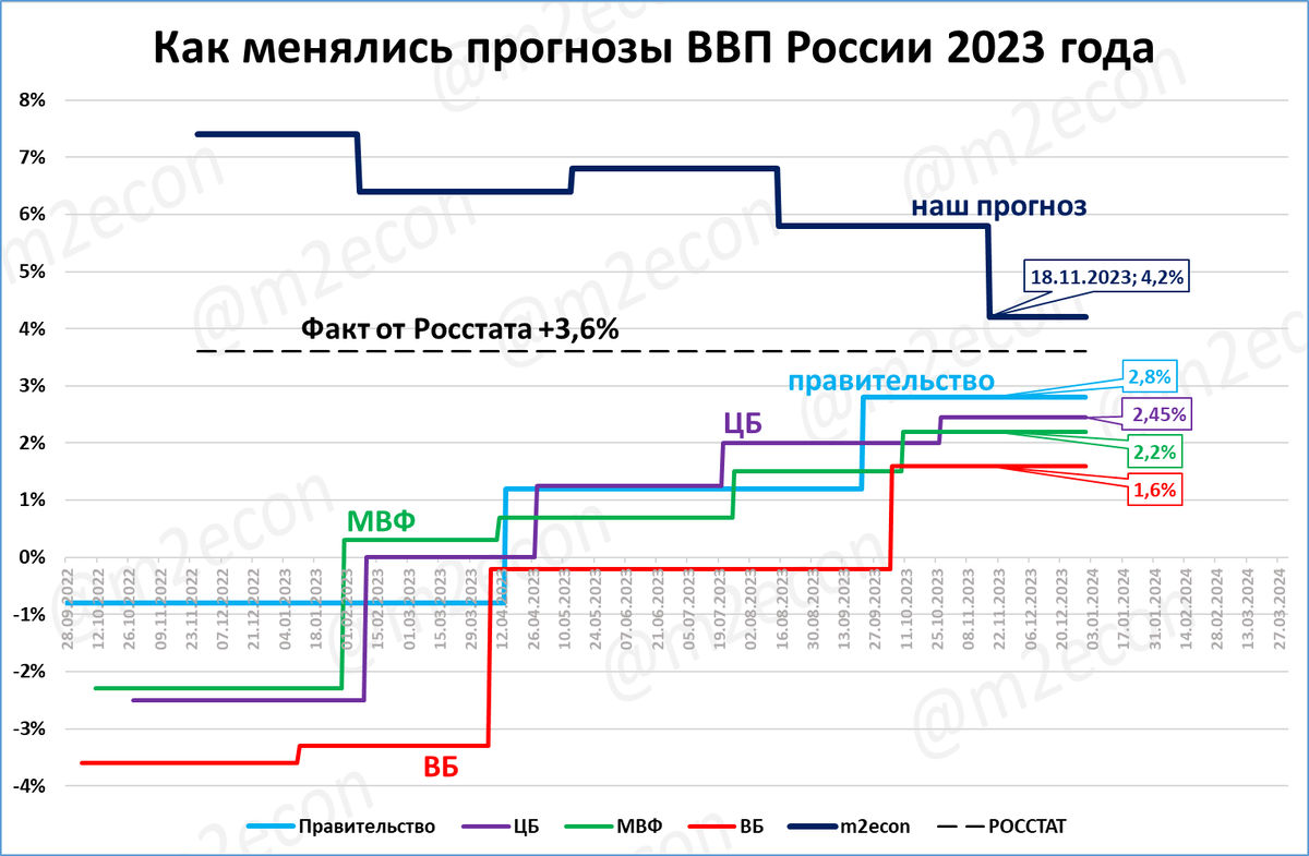 Напомню, что осенью 2022 года мы прогнозировали рост ВВП, в то время как МВФ, Всемирный банк, ЦБ, правительство ожидали падение ВВП в 2023 году от -1 до -4%.