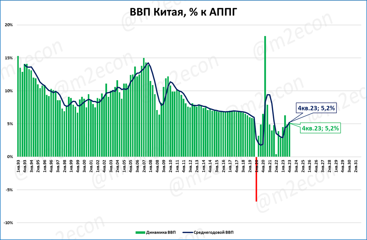 Это значит, что ближайшие перспективы ВВП Китая вне опасности. По итогам 2023 года ВВП вырос на 5,2%.