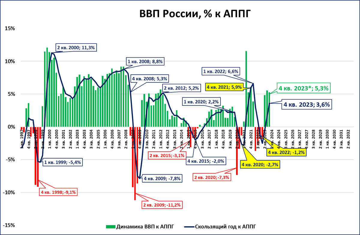 В 4 квартале рост составил около 5,2…5,3%. Начиная с 4 квартала 2008 года (то есть, за 61 квартал) это всего лишь восьмой квартал, когда ВВП растёт темпом выше 5% годовых.