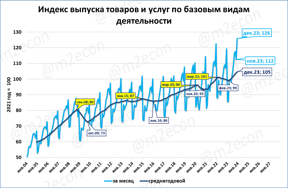 Росстат опубликовал индекс выпуска базовых отраслей экономики*. Декабрь стал рекордным месяцем за всю историю (предыдущий рекорд был установлен в декабре 2021 года).