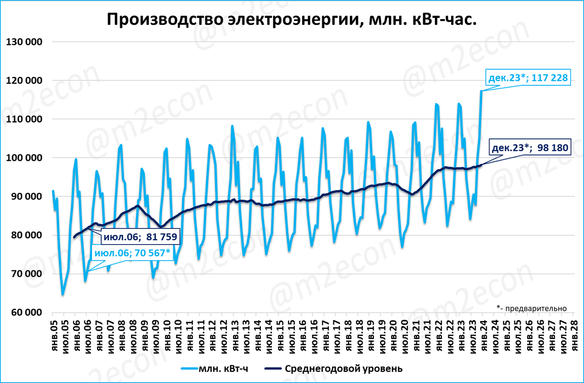 По предварительным данным Росстата, в декабре было произведено 117 млрд. кВт-часов электроэнергии.