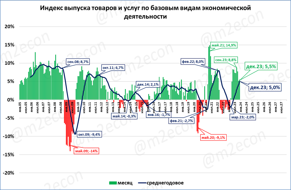 *- официальное название: индекс выпуска товаров и услуг по базовым видам экономической деятельности. Кроме промпроизводства включает в себя сельское хозяйство, строительство, транспорт и торговлю (розничную и оптовую). Доля этих отраслей в составе ВВП – около 60%.