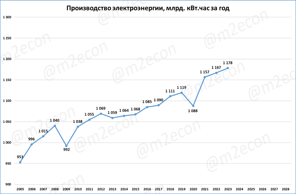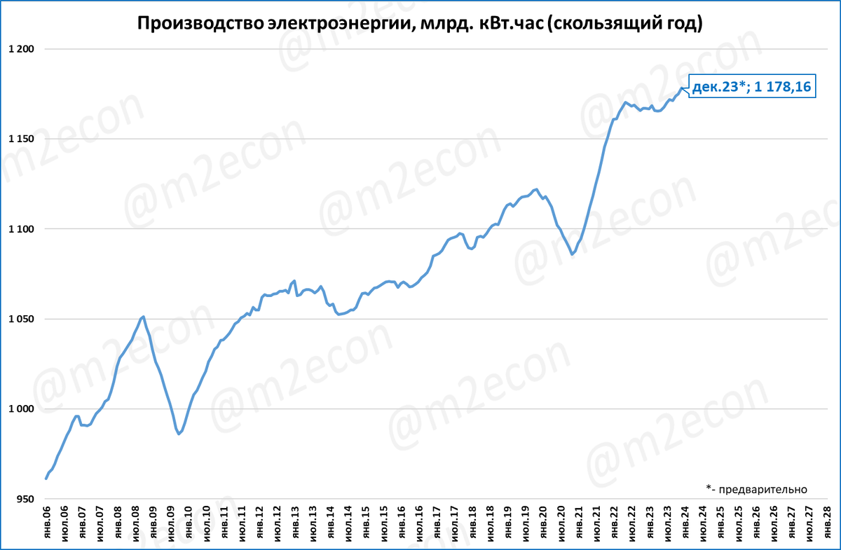 Выпуск электроэнергии в декабре вырос на 2,9%. Рост за весь 2023 год составил +1%. Год стал рекордным по производству электроэнергии за всю историю.