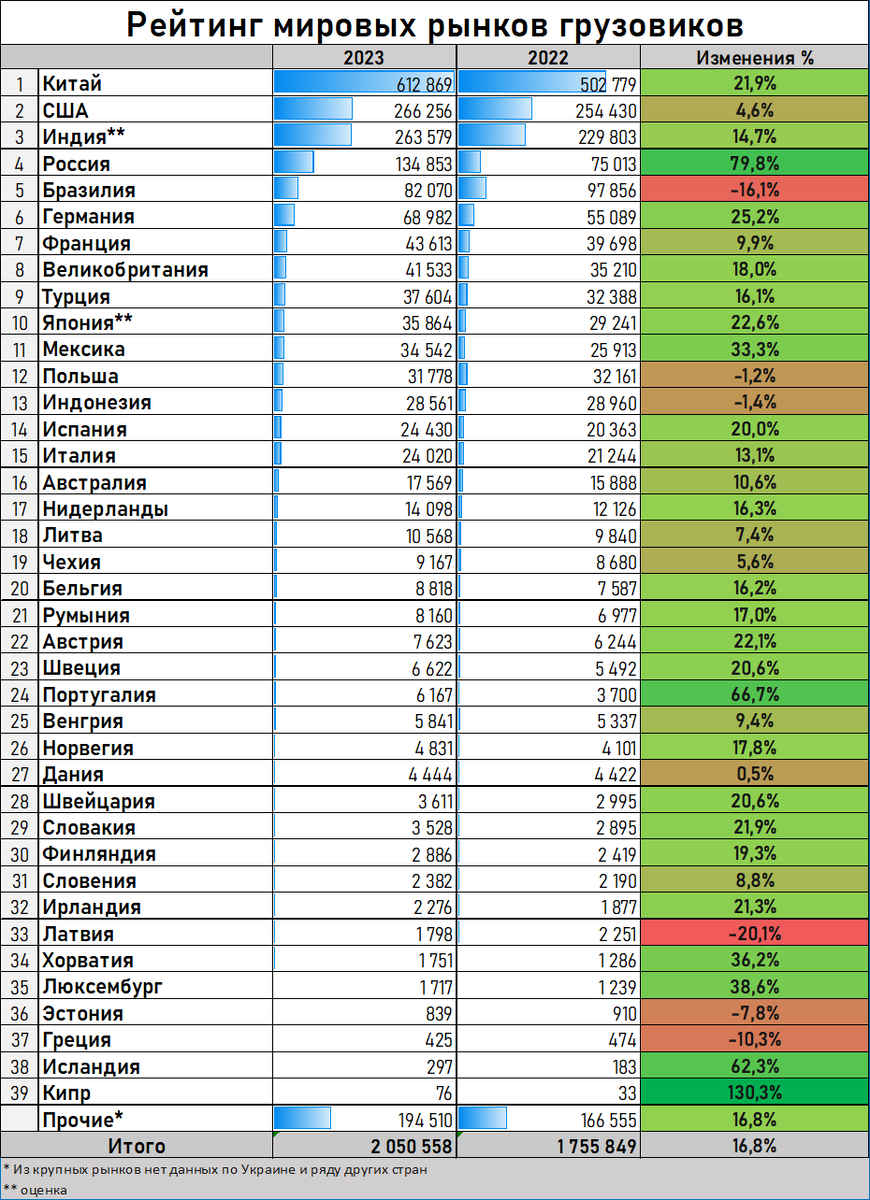 В таблице приведён рейтинг мировых рынков тяжёлых грузовиков по итогам 2023 года.