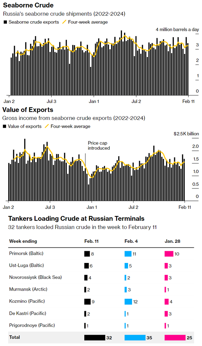 Всё хорошо. Нефть продолжает отгружаться морем в приемлемых объёмах. 3,4 млн.баррелей в сутки в среднем. Это меньше, чем на позапрошлой неделе, но больше чем в обычные недели 2022-2023 годов. Я так думаю, всё потому, что потолок.