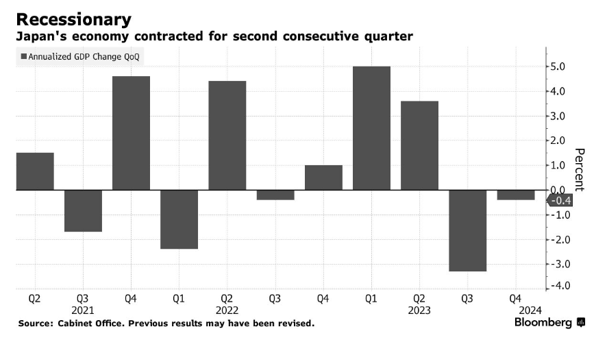 ВВП Японии в четвёртом квартале упал на 0,4% в годовом исчислении, что значительно меньше роста на 1,4%, ожидаемого экономистами, опрошенными Reuters. Это следует за сокращением на 3,3% в третьем квартале.