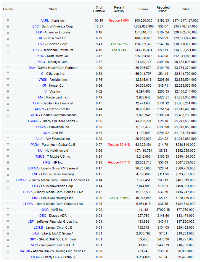Последняя отчётность фонда показала, что на 78% сократились вложения в Hewlett-Packard. Также фонд избавился от 32% своей доли в медиакомпании Paramount Global, продав 30,4 млн акций. Berkshire также отказалась от своих инвестиций в платежный бизнес StoneCo, страховщиков Globe Life и Markel Corporation, а также домостроителя DR. Horton.