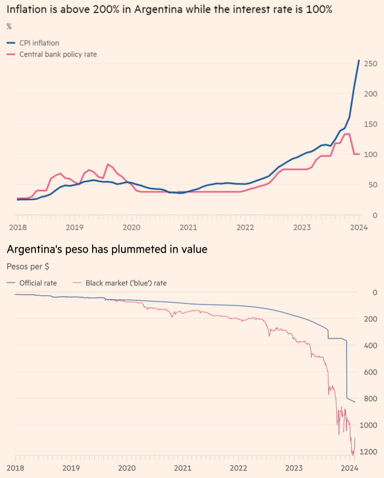 По итогам января 2024 годовая инфляция в этой волшебной стране достигла 254,2%. Обновлён тридцатилетний рекорд. Ура, товарищи! И да, в Аргентине праздник. Новый Аргентинский лидер Милей «Лохматый» заявил в прошлом месяце, что январский показатель ниже 25% станет “поводом для празднования” и признаком успеха его стратегии, которая направлена на сокращение расходов, чтобы положить конец зависимости Аргентины от печатания денег.