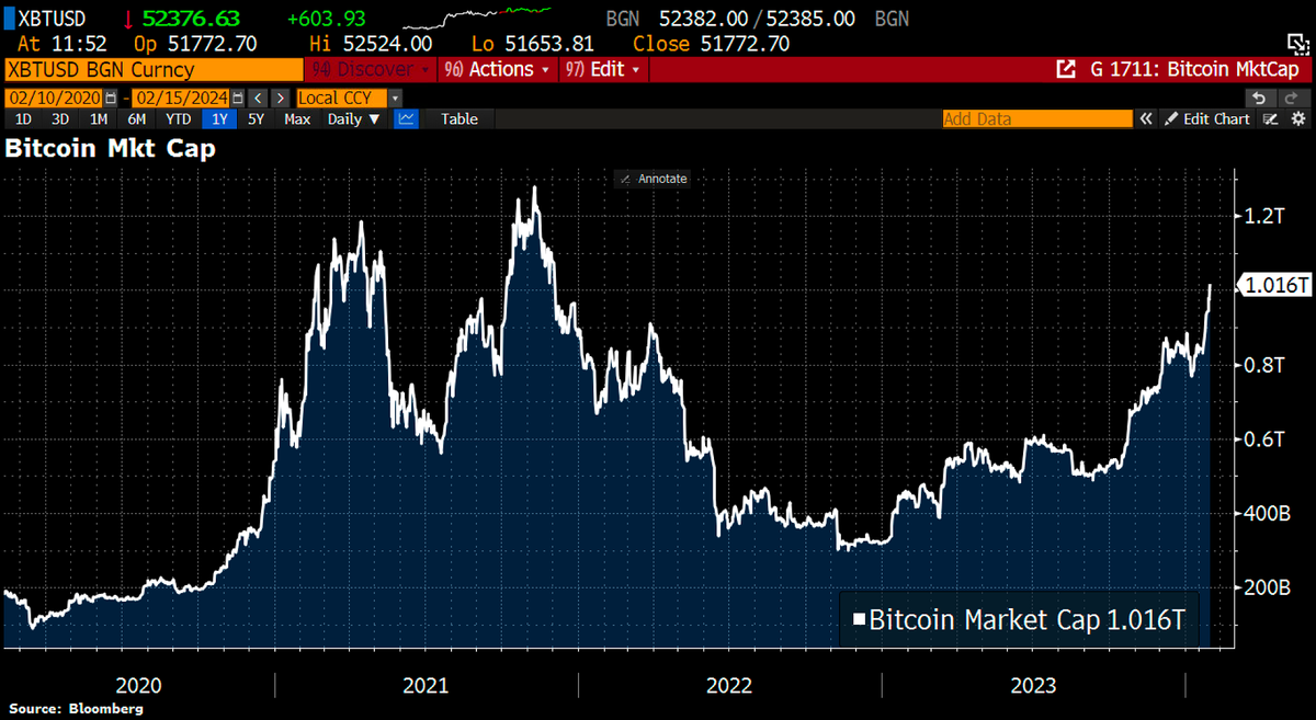 Рыночная капитализация Биткойна превысила 1 трлн $.