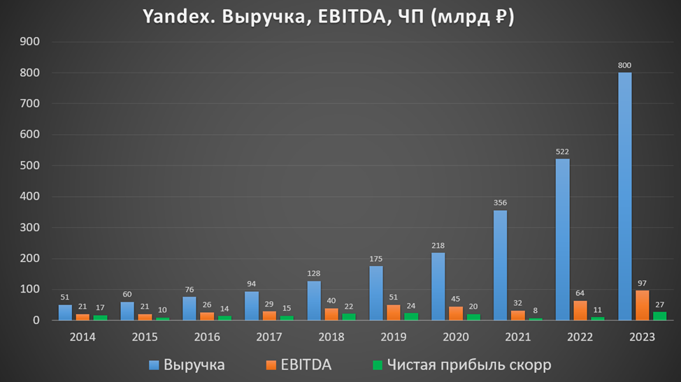 Большое падение ЧП случилось из-за эффекта от продажи «Дзена» и «Новостей» в 2022 году за 38 млрд. Если очистить прибыль от разовых факторов, опционных программа и курсовых разниц, то ЧП скорр = 27,4 млрд (+155% г/г).