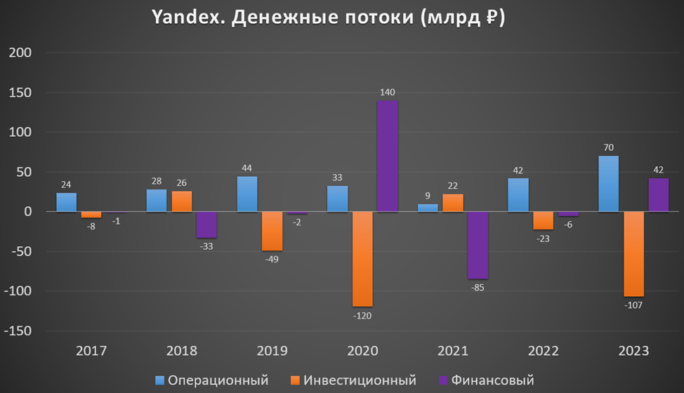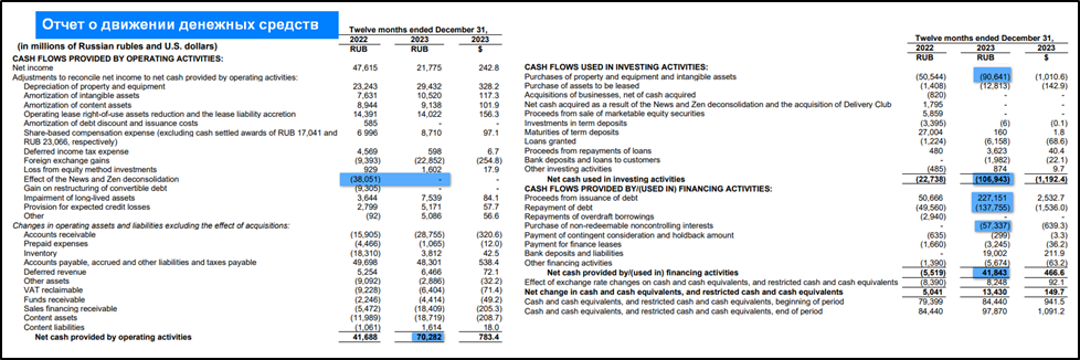 операционная деятельность 70 млрд (+69% г/г). Именно столько денег поступило в компанию за полгода. Основная разница в результате – это отсутствие эффекта выбытия «Дзена» и «Новостей».
