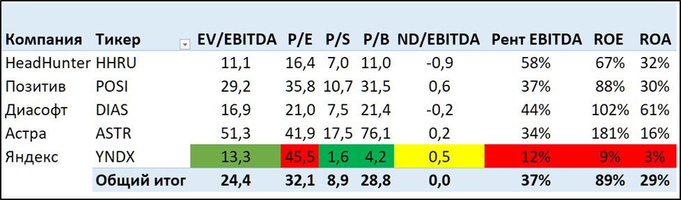 В сравнении по мультипликаторам с другими IT компаниями РФ, - Яндекс хуже всех выглядит по P/E, а также по рентабельности. Остальные мультипликаторы лучше.