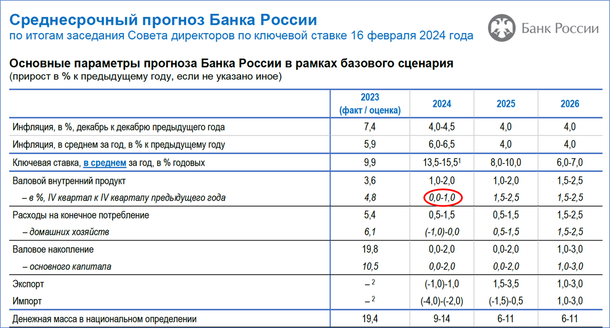 ЦБ также приводит ожидаемый темп роста ВВП в 4 квартале 2024 года: от 0 до 1%.