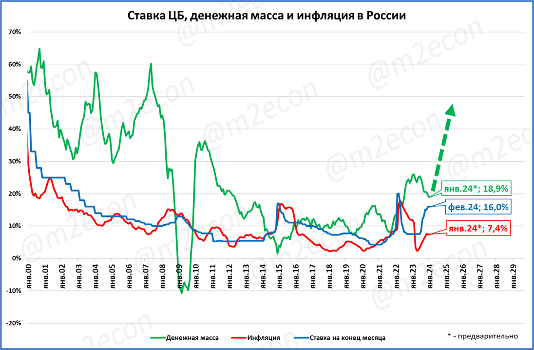 Второе. Достаточен ли нынешний уровень ставки для контроля над инфляцией, сказать невозможно, пока темпы роста денежной массы не доведены до 30-60%, как это было в 2000-2008 годах (зелёная пунктирная стрелка на графике).