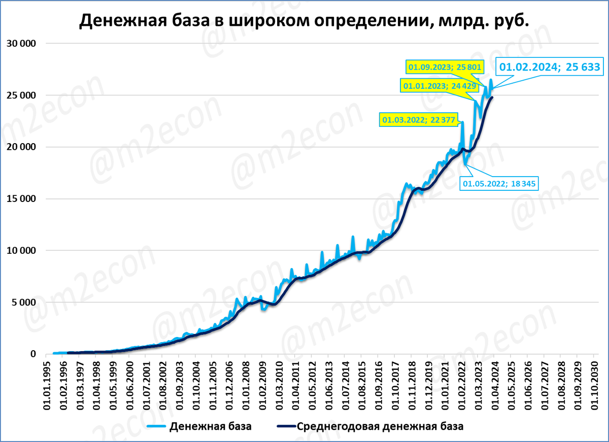 На 1 февраля 2024 года широкая денежная база (ДБ) составила 25,6 трлн. рублей