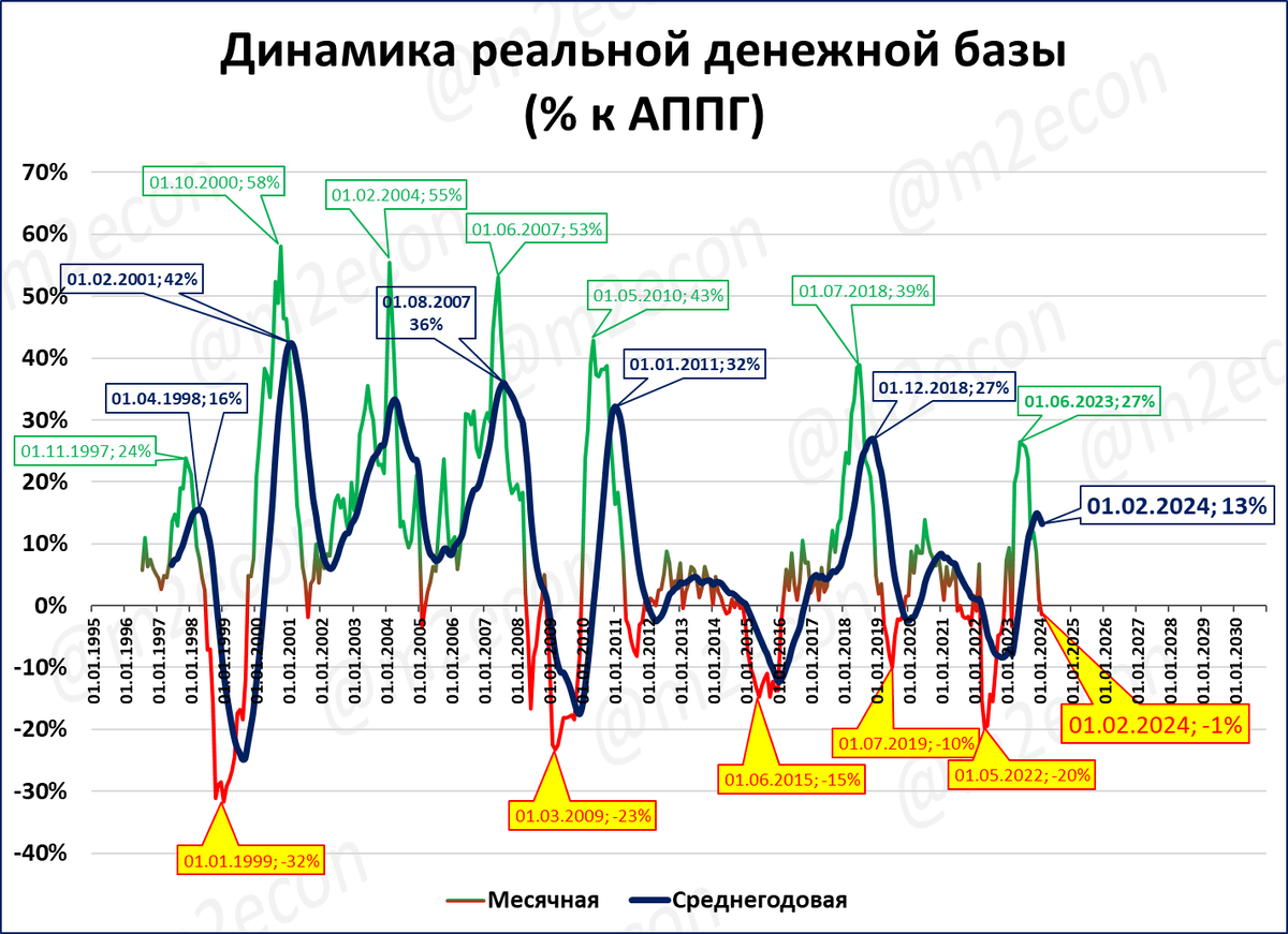 В прошлом такие падения реальной денежной базы предшествовали кризисами 1998, 2008, 2015 годов. Иногда (как в 2002 и 2005 годах) падения ВВП не происходило, но резко замедлялся рост инвестиций в основной капитал. Так с 20% в 3 кв. 2000 года рост инвестиций замедлился до 1% в 1 кв. 2002 года. Другой пример: с 21% в 1 кв. 2004 рост инвестиций замедлился до 6% в 1 кв. 2005 года.