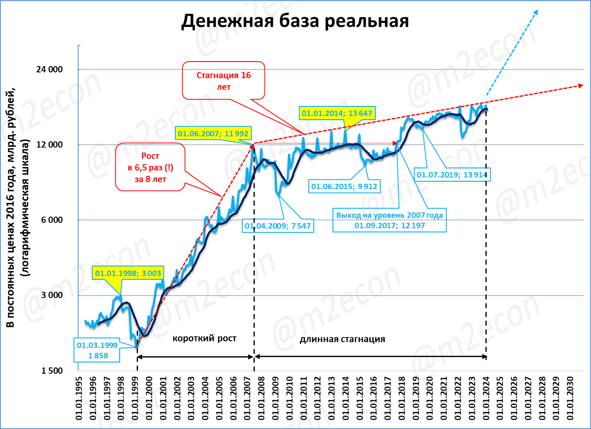Голубая пунктирная стрелка на графике реальной денежной базы показывает, куда должна бы идти реальная денежная база, чтобы в экономике был быстрый рост.