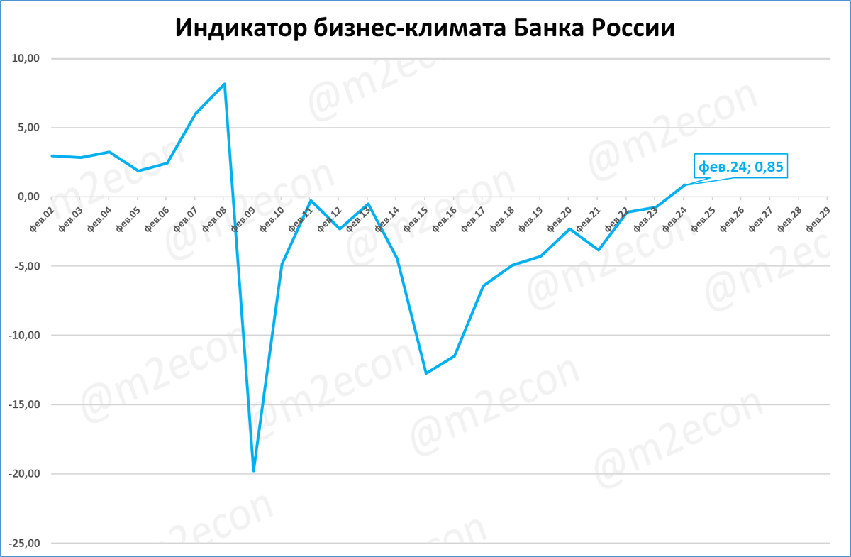 ЦБ опубликовал свой индикатор бизнес-климата. Он рассчитывается на основе опроса более 10 тыс. предприятий. Февраль стал лучшим с 2008 года и впервые с того года вышел в положительную зону.