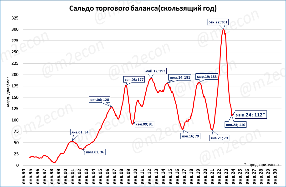 Сальдо за последние 12 месяцев (скользящий год) составило 112 млрд. долларов.