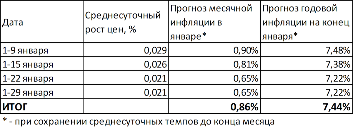 Наши расчёты показывают, что для выхода на 4% к концу 2024 года среднемесячный рост цен должен в оставшиеся месяцы, включая февраль, составлять 0,28%.