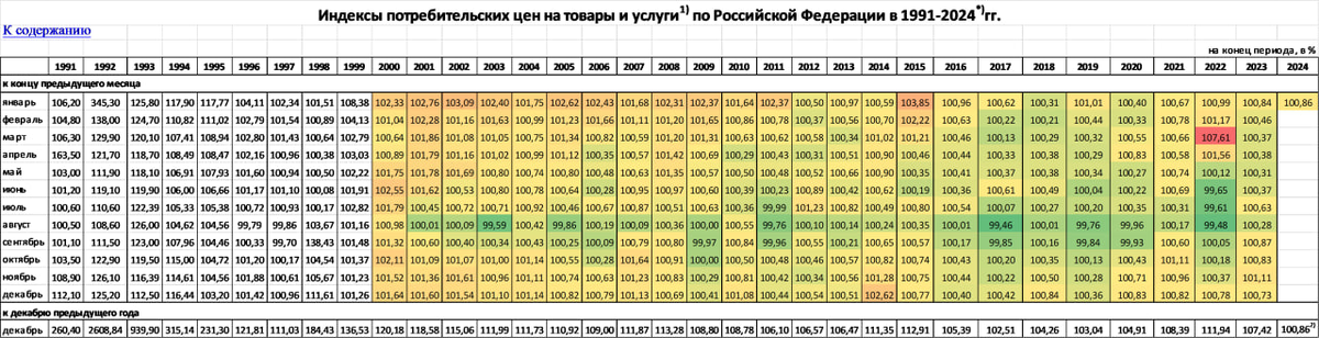 Напомню, для сравнения, что в последние три месяца он составляет 0,90%. Однако надо учитывать сезонность. В летние месяцы очень часто наблюдается низкая инфляция и даже снижение цен (дефляция). В таблице ниже месяцы с низкой инфляцией и дефляцией показаны зелёным цветом.