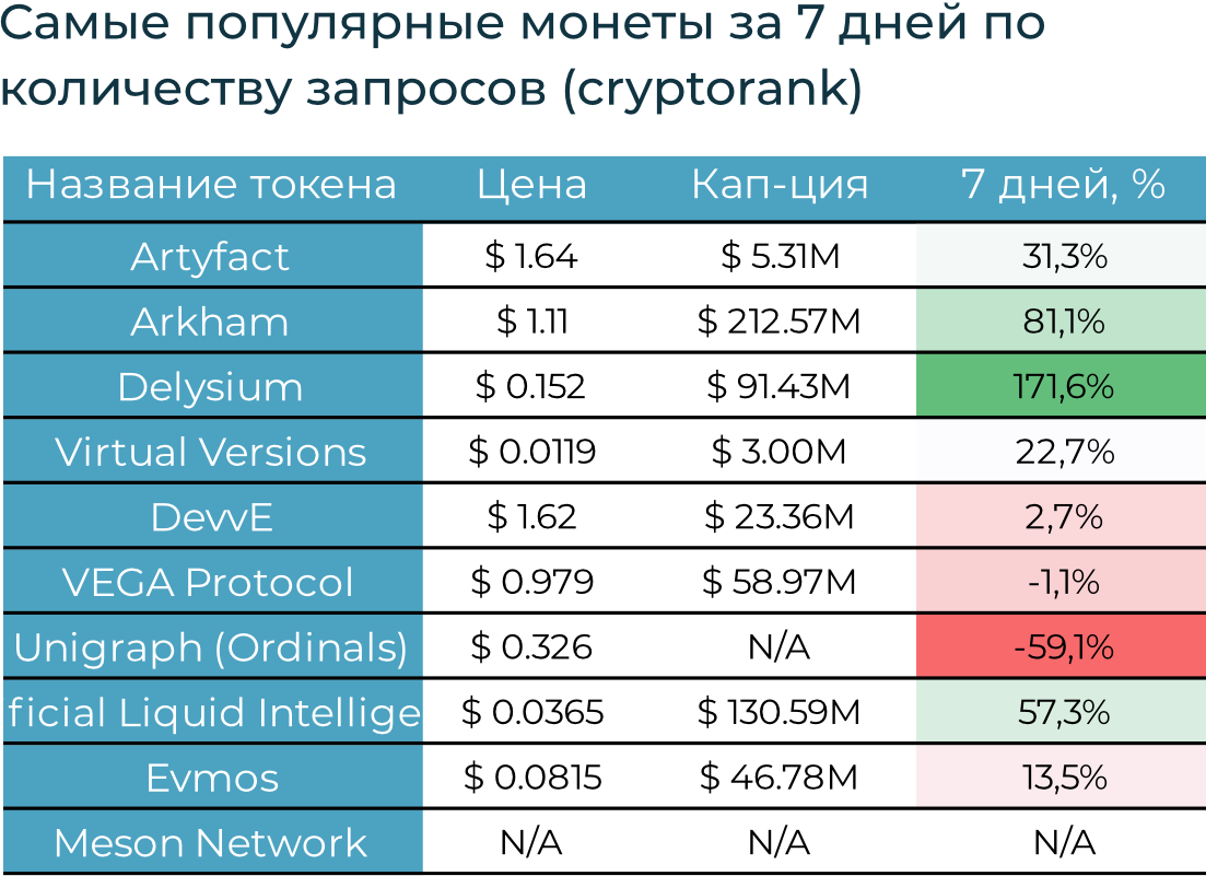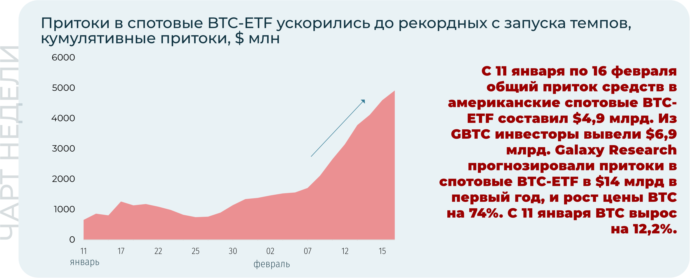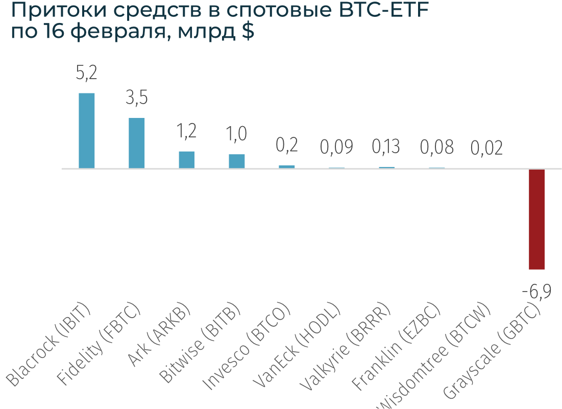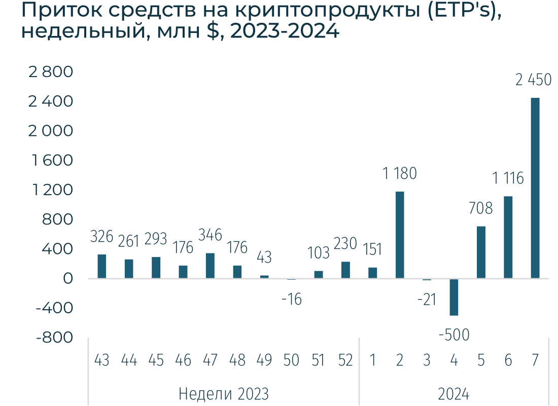 Продолжились рекордные притоки в криптопродукты: +$2,5 млрд за неделю, +$5,2 млрд с начала года. За весь 2023-й притоки составили $2,1 млрд. BTC за неделю вырос на 4,3% до $52,1 тыс., ETH - вырос на 9% до $2,9 тыс.