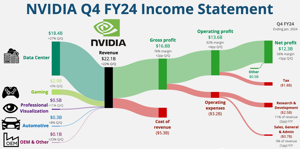 Выручка Нвидии растёт прямо на глазах. 22,1 млрд $, что на 265% больше, чем год назад. Центра обработки данных затаскивают в кубышечку рекордные 18,4 млрд $. Всё остальное и рядом на валялось.