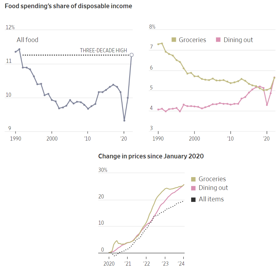 А тут оказалось, что доля доходов, которая идёт на пожрать у американцев достигла уровня 30-летней давности. Она не то чтобы очень великая, нет - всего 11,3% - но сам факт. С 2020 года резкий взлёт на 2%. В последний раз, когда американцы тратили столько денег на еду, Джордж Буш-старший был у власти, а в кинотеатрах шёл “Терминатор 2: Судный день”. Блин, какой я старый.