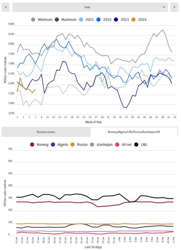 На позапрошлой неделе поставки газа в Европу слегка подросли. До 5 774 млн.куб.м. Через трубопроводы пролетело 666 млн.куб.м. отечественного имперского газа. Традиционно, наша доля есть и в поставках СПГ, но нам её не сообщают. Всё это скрывается под красивой вывеской - страна СПГ.