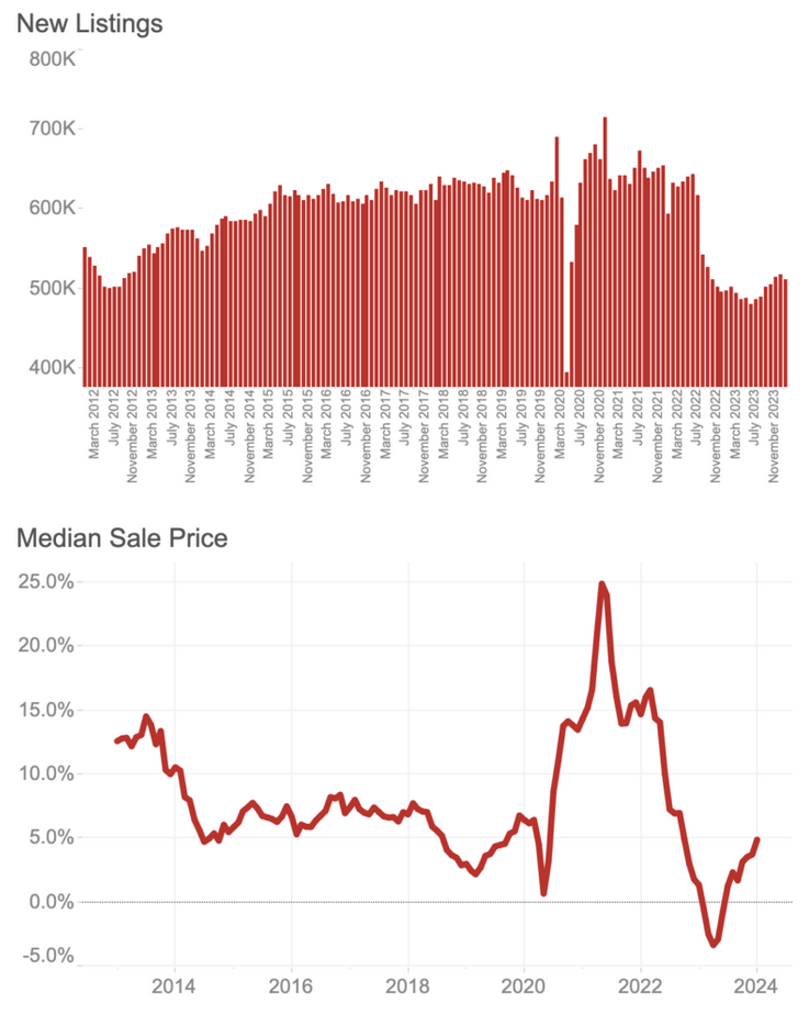 Медианная цена продажи дома выросла на 5,2% в годовом исчислении и составила 402 343$. Это стало самым большим скачком с сентября 2022. По сравнению с предыдущим же месяцем цены практически не поменялись.