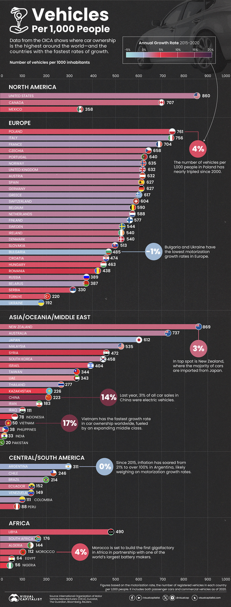 Если брать по миру в целом, то лидирует тут Новая Зеландия с результатом 869 авто на 1000 человек. Удивила Польша. Автолюбители там имеют 761 машину на 1000. Россия показывает цифры 389 авто и рост на 2% за период 2015-2020. Ну это к рассказам про нищую страну и и до чего нас довёл известно кто. Украина за тот же период показала «отрицательный рост» в (-1)%.
