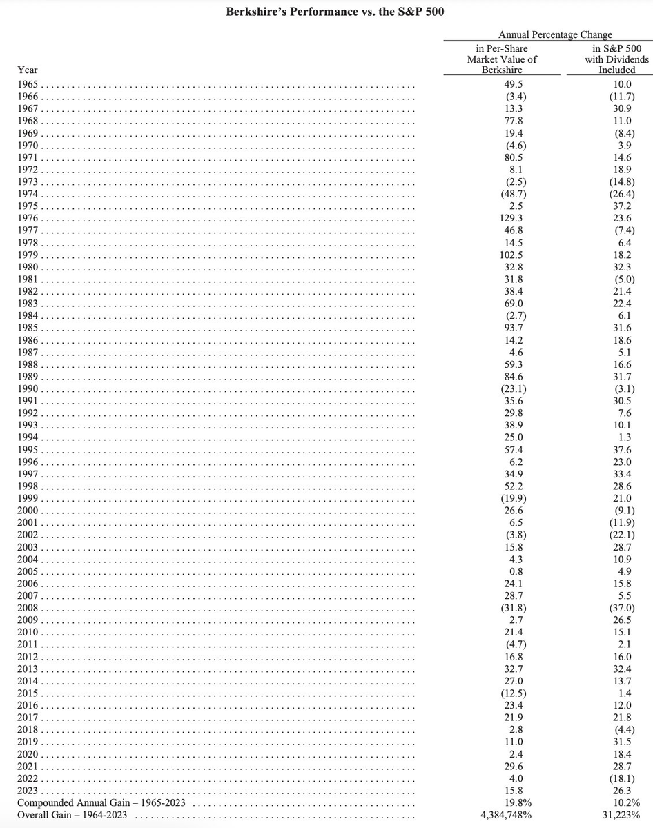 Если рассматривать рыночную стоимость акций Berkshire Hathaway, то с 1965, момента, когда Баффетт завладел их контрольным пакетом, рост составил 4 384 748 %. При этом среднегодовой прирост всего 19,8%. S&P 500 за аналогичный период вырос на 31 223%.