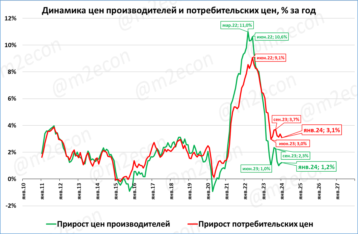 Для сравнения: реальные цены производителей в России сейчас растут (см. далее в разделе “Экономика России”).