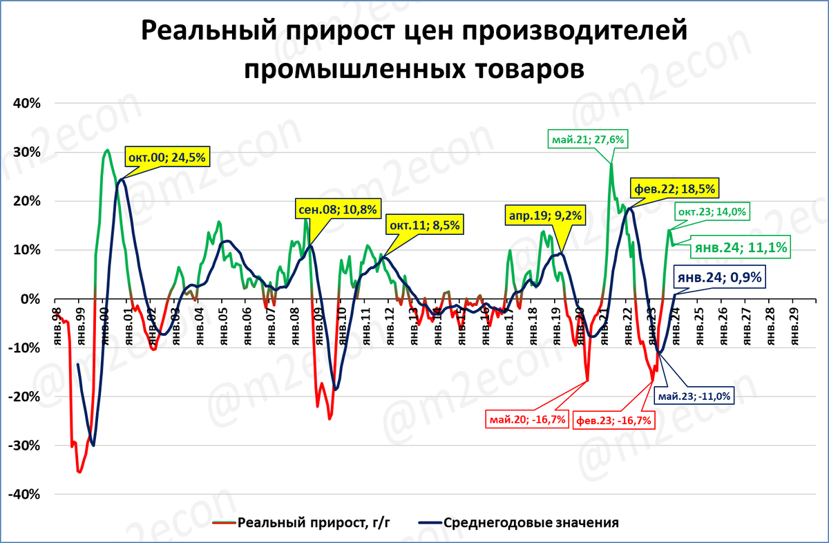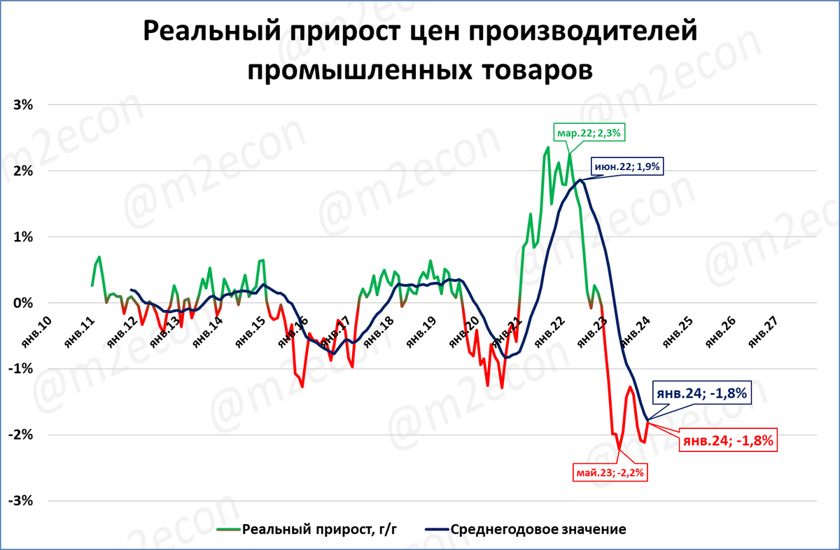 Как видно на графике, нынешнее снижение цен производителей – самое масштабное как минимум с 2011 года (за 13 лет). Падение реальных цен производителей – это, как правило, негативный сигнал. Грубо: производители не могут индексировать свои цены хотя бы на размер инфляции.
