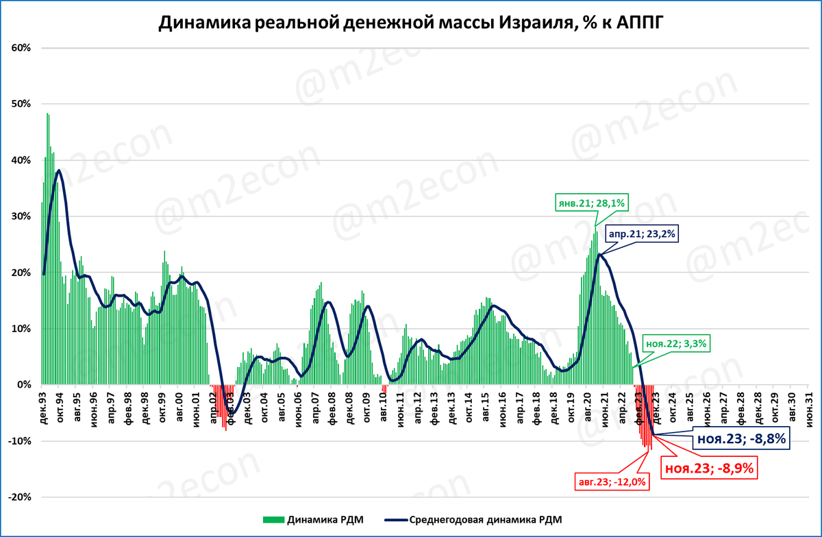 В обоих обзорах отмечали, что РДМ в Израиле сокращается беспрецедентными темпами, и что при таком зажиме реальной денежной массы для остановки роста ВВП никакой войны не нужно.
