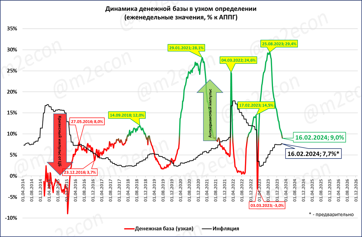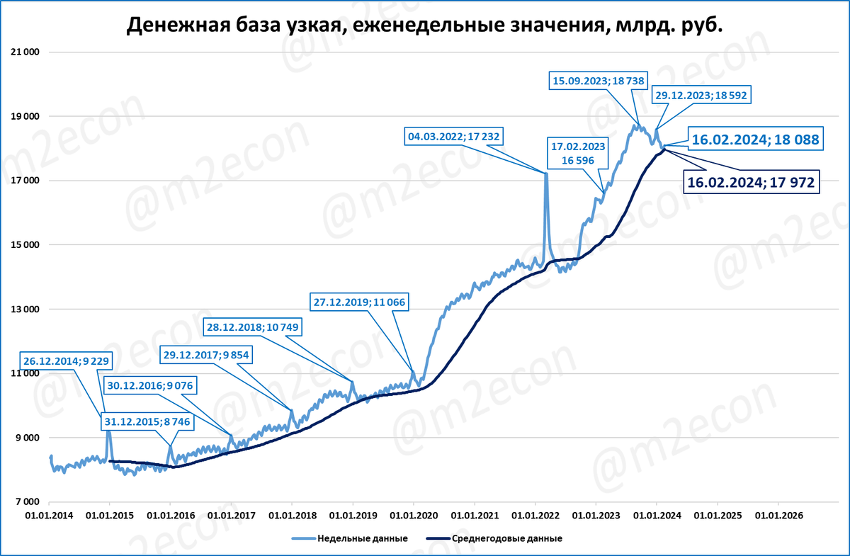Как сообщает ЦБ, узкая денежная база на 16 февраля составила 18,1 трлн рублей.