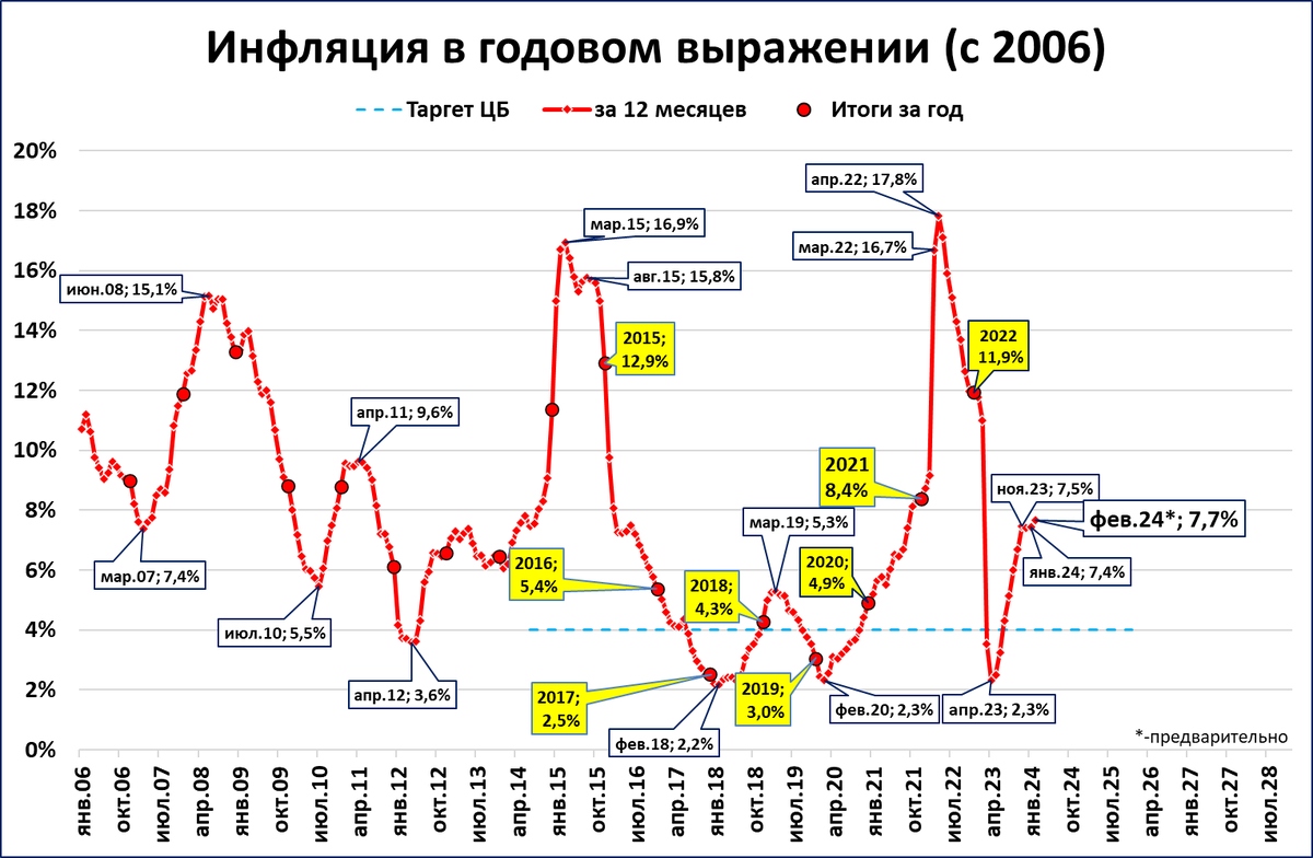 Инфляция в феврале пытается стабилизироваться на уровне 7,7%.