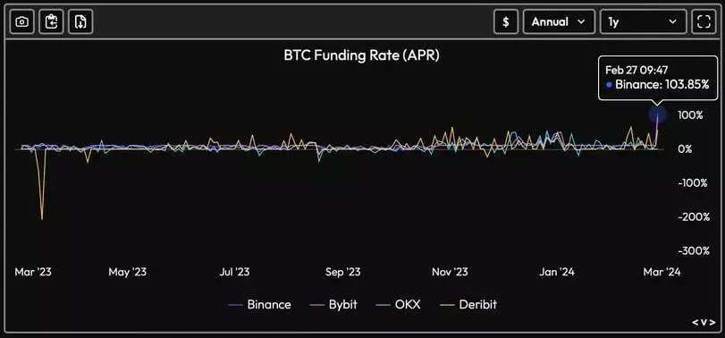 Согласно данным портала аналитической информации о крипторынке Velo Data, годовая ставка фьючерсов на крупнейшей бирже Binance впервые за год превысила 100%. Аналогичные ставки финансирования на биржах Bybit и Deribit выросли до 95% и 56%, что демонстрирует значительный рост впервые с марта 2023 года.