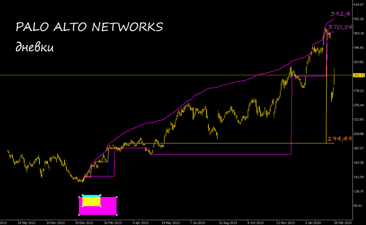 Ну и смотря на это всё, решил я глянуть, что там Палой Алтой? Куда идёт цена? Недавно на 370,54 перетёк уровень максимального горизонтального объёма. После чего бумага на плохом отчёте ливнула процентов на 30. Именно перед этим Ненси зашла первой партией. Отметим, что на самом лое провала она усреднилась. Правда не полным объёмом. Так бы была уже в профите. Но время есть. К тому же цель! Целевая кривая сейчас на 392,4. А при сходе с ценой будет и того выше. Также ждём миграция второго объёмного уровня, который пока болтается на 194,49. Если цена придёт на целевую, то Ненси нормально подымет бабла.
