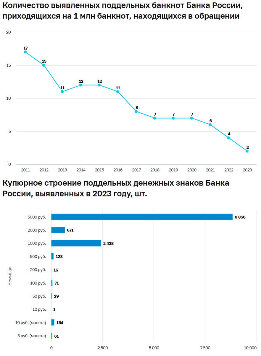 В 2023 году количество выявленных в банковской системе поддельных российских банкнот и монет сократилось почти в два раза и составило порядка 12,4 тыс. штук. На 1 млн банкнот, находящихся в обращении, приходилось всего две фальшивки (в 2022 году — четыре).