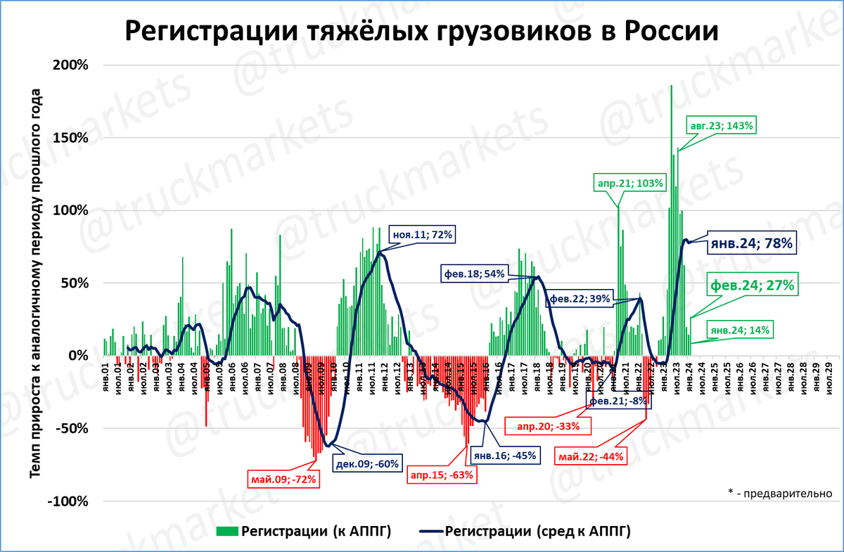 По нашим предварительным расчётам регистрации тяжёлых грузовиков (полной массой более 14 тонн) составили порядка 9,76 тыс. штук.