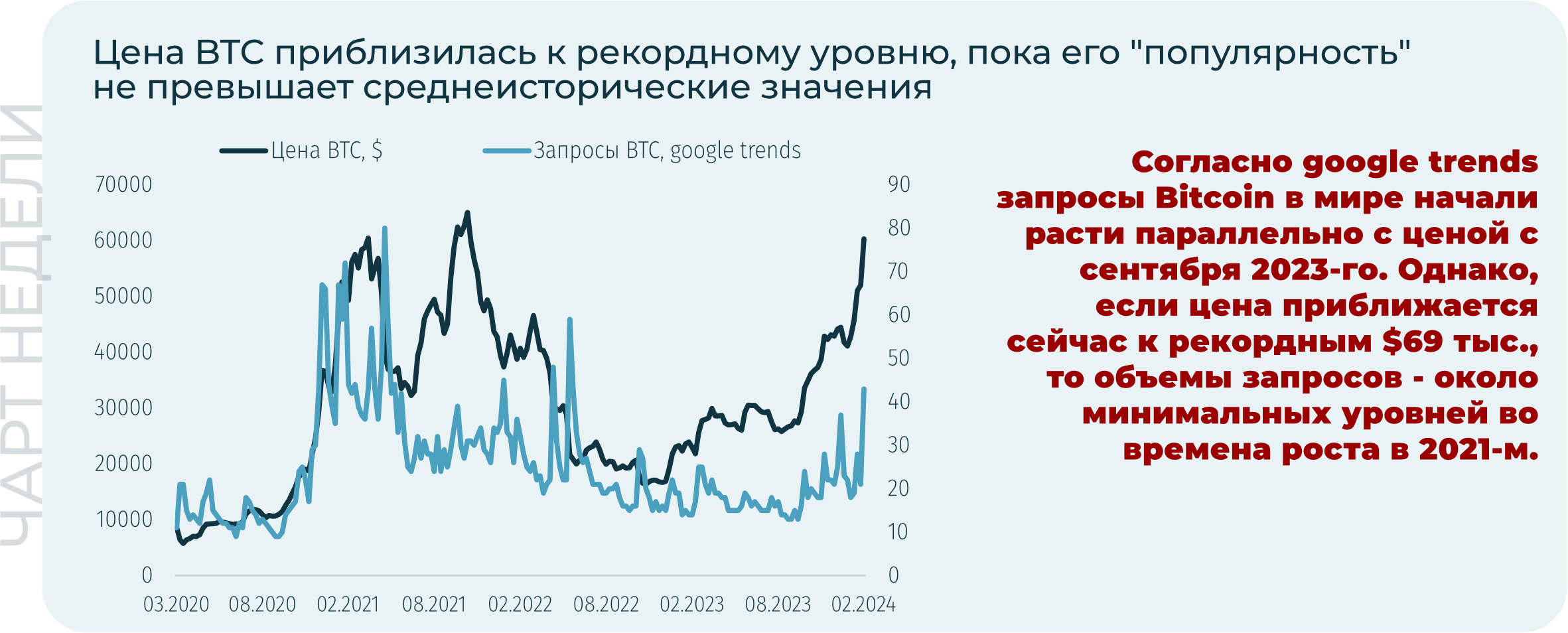 Продолжились притоки в криптопродукты: +$1,8 млрд за неделю. С 11 января (запуск спотовых ETF) по 5 марта цена BTC выросла на $20,1 тыс. Притоки за аналогичный период в спотовые ETF составили $7,9 млрд. Соотношение роста капитализации к притоку — 52x. Galaxy Research прогнозировали мультипликаторы на притоки от 3,7x до 8,8x. Однако главный аналитик Bloomberg по ETF Эрик Балчунас в Twitter заявил, что текущие заявки на покупку акций спотовых ETF выглядят как: “несколько заявок на +$10 млн, дюжина на +$1 млн и остальные меньше”. Что говорит об институциональном потенциале, который еще не был исчерпан.