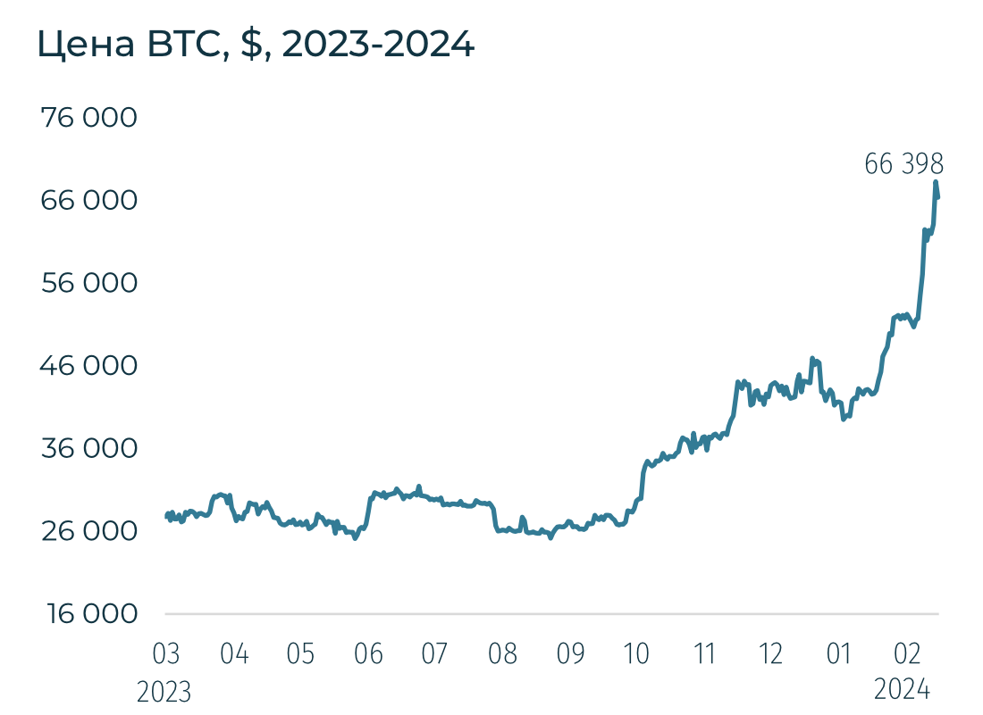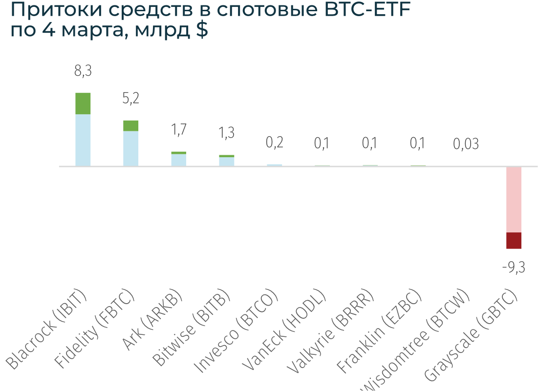 BTC в ночь на 5 марта достиг отметки $68,6 тыс., практически превысив абсолютный рекорд в $69 тыс. в 2021-м году. С начала года BTC вырос на 51%, а вторая крупнейшая криптовалюта Ethereum — на 62% до $3,7 тыс. Продолжились рекордные притоки в спотовые ETF, из которых фонд от BlackRock стал самым популярным среди институциональных инвесторов.