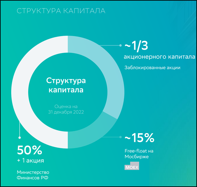 Половина акций компании принадлежит Министерству финансов РФ, 15% - фрифлоат на МосБирже и треть акционерного капитала – это заблокированные акции нерезидентов.