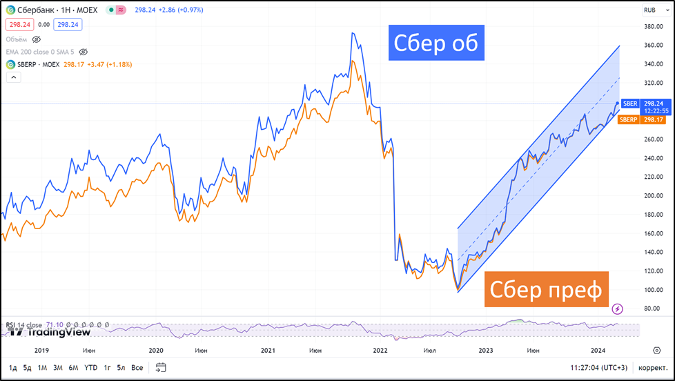 На Московской бирже торгуются обыкновенные и привилегированные акции Сбербанка. Последнее время цена этих акций почти совпадает. За 2023 год котировки практически удвоились. Таким образом рост был в 2 раза лучше, чем у индекса Мосбиржи. И вообще с октября 2022 года, когда завершилась частичная мобилизация, акции находятся в восходящем тренде. В начале марта котировки преодолели отметку 300₽, т.е. вернулись к уровням января 2022 года.