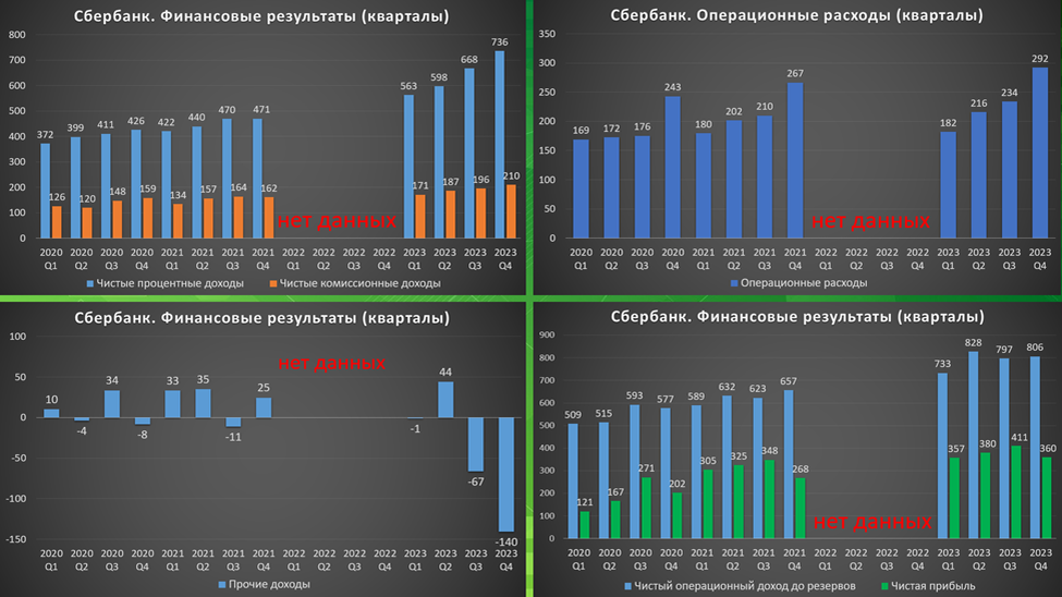 Посмотрим на квартальные данные. Чистые процентные и комиссионные доходы подросли примерно на 10% кв/кв. Но выросли и операционные расходы до 292 млрд (+25% кв/кв), а также прочие доходы показали резкий убыток в 140 млрд за квартал. Отчисления на резервы 30 млрд (это минимальное значение в 2023 году). В итоге, Чистый операционный доход 805 млрд (+1% кв/кв). А ЧП 360 млрд (-13% кв/кв).