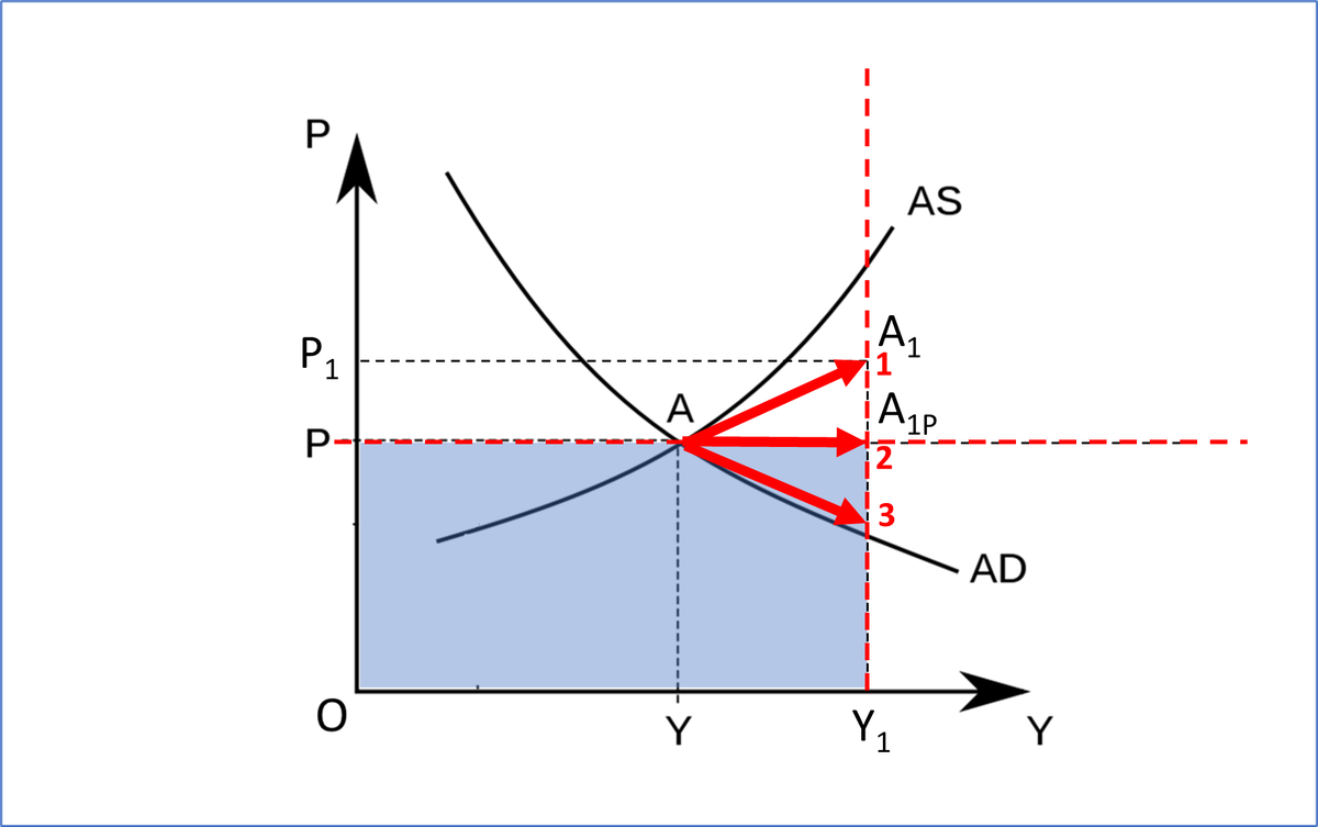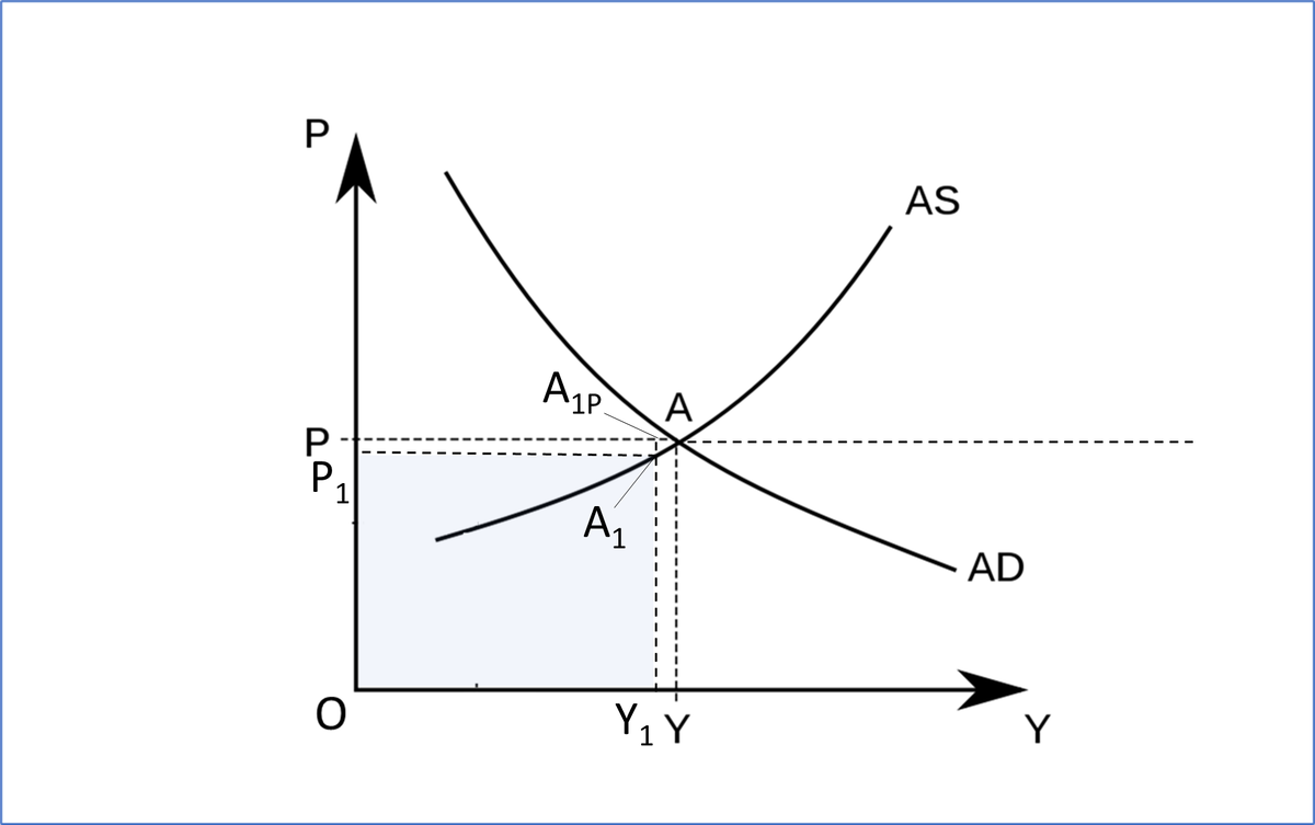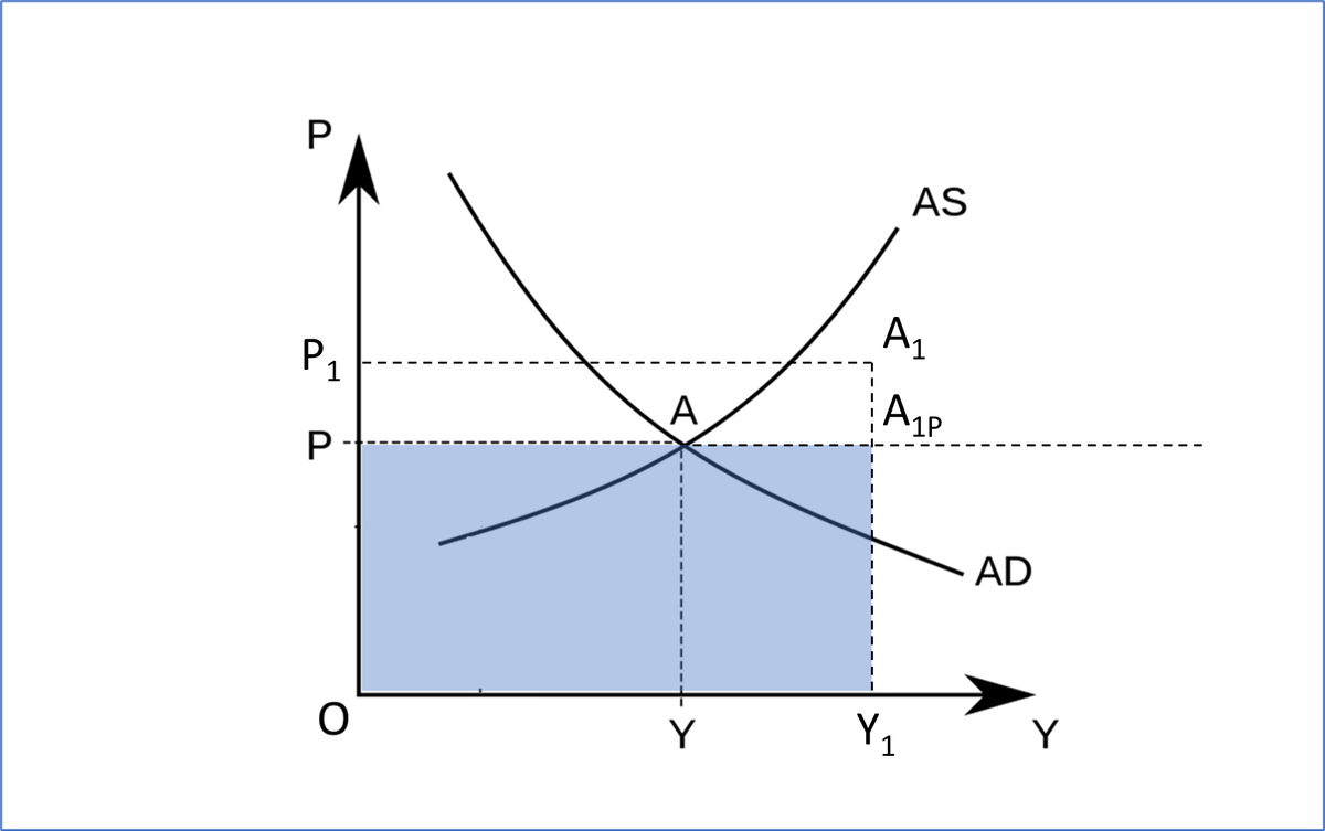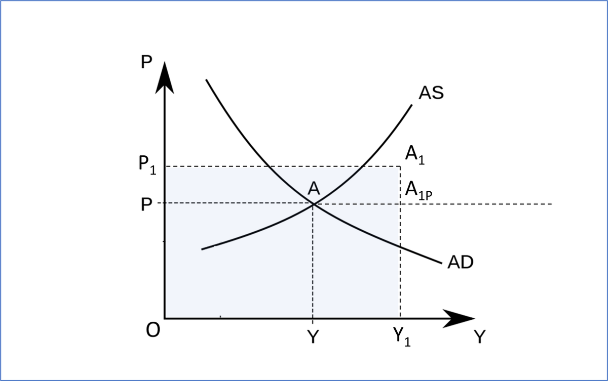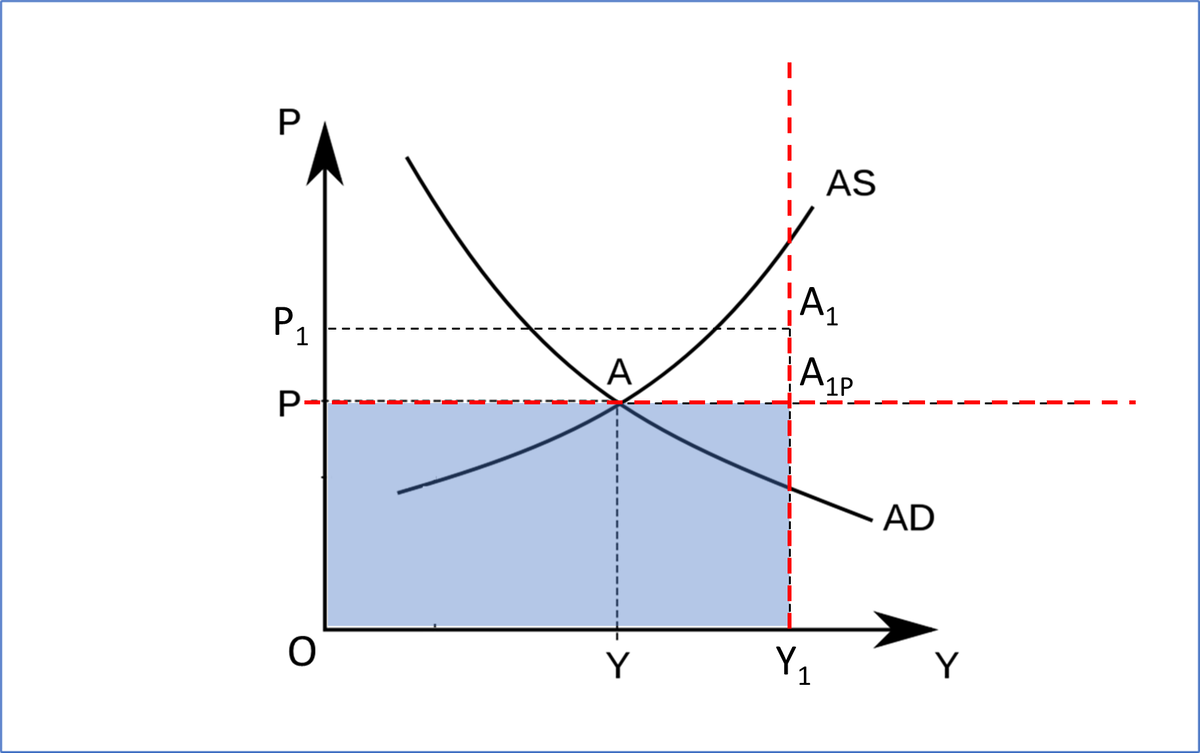 Допустим, равновесие сместилось в точку A1, установился новый уровень цен Р1 и новый объём производства Y1. Тогда новый объём денежной массы будет равен площади прямоугольника О Р1 А1 Y1 (показан на графике ниже светлой заливкой).