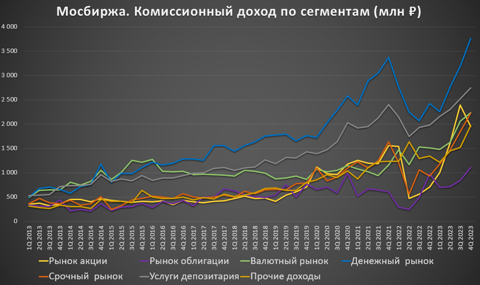 Комиссионные доходы растут вслед за объемом торгов. Они увеличиваются по всем сегментам. В лидерах по комиссиям: Денежный рынок, а также Расчетно-депозитарные услуги.