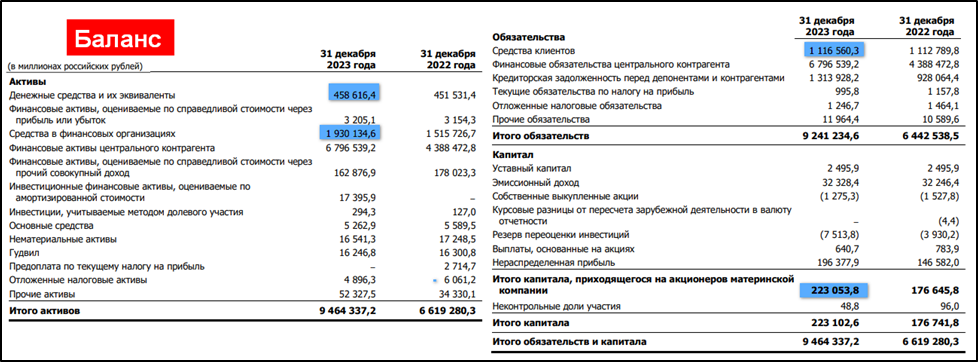 Также Мосбиржа сообщила, что размер собственных денежных средств по итогам 2023 года составил 139 млрд. А долговые обязательства отсутствуют. Т.е. чистый долг отрицательный.